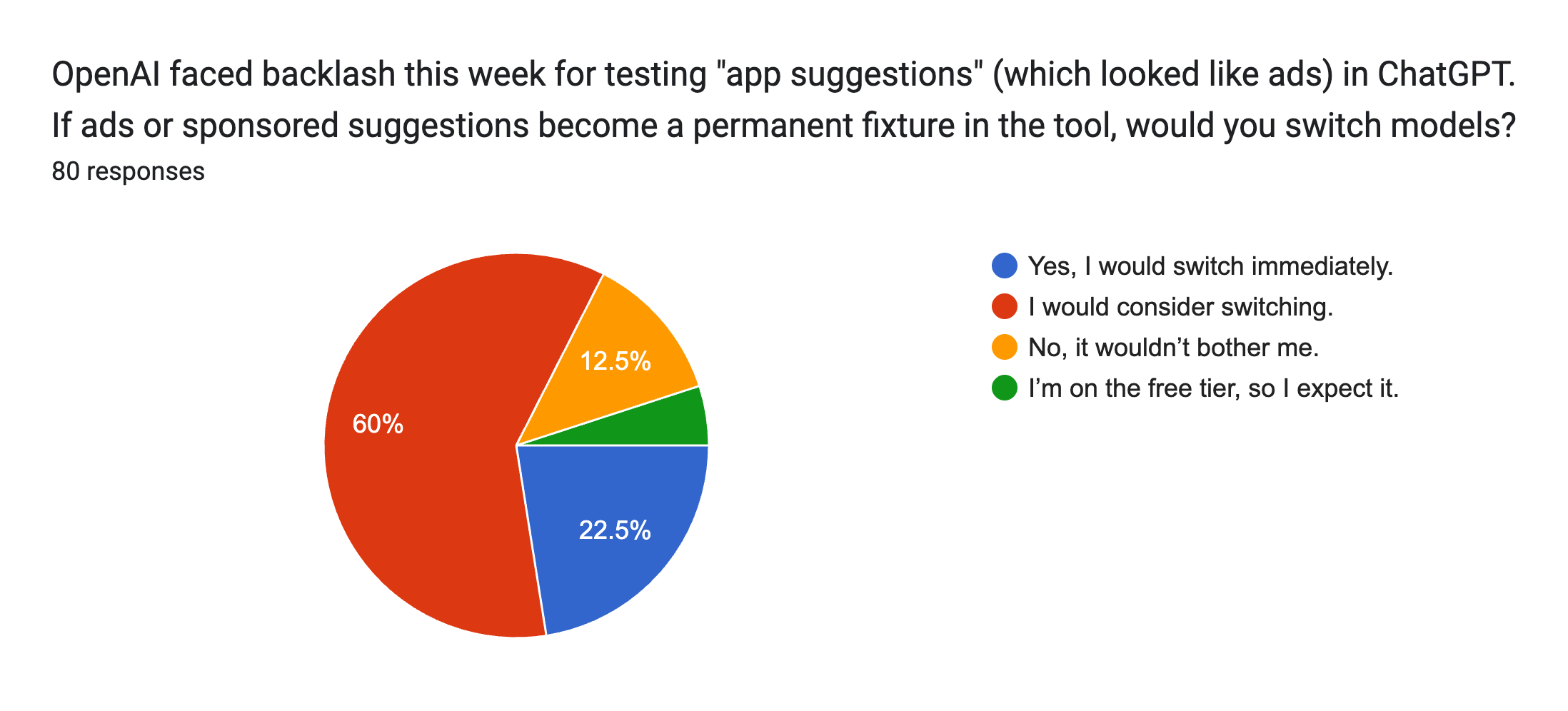 According to our latest AI Pulse survey, which polled 80 professionals, the vast majority of users are not willing to tolerate an ad-supported experience. In fact, 82.5% of respondents indicated they would rethink their use of the tool if ads or sponsored suggestions became a permanent fixture.