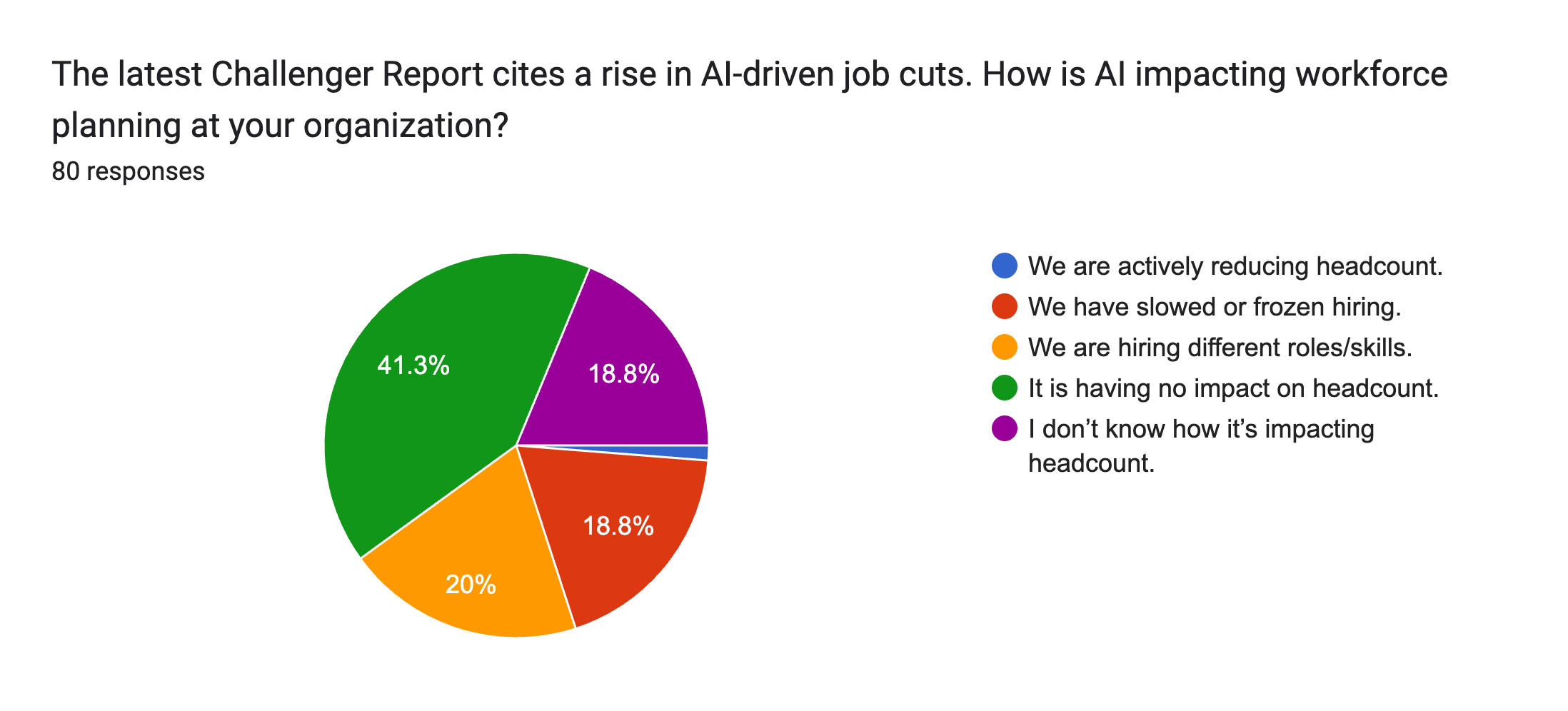 This week, we also asked about how AI is impacting workforce planning at companies. While headlines continue to warn of AI-driven job cuts, the on-the-ground reality for our audience is more complex than a simple "replacement" narrative.