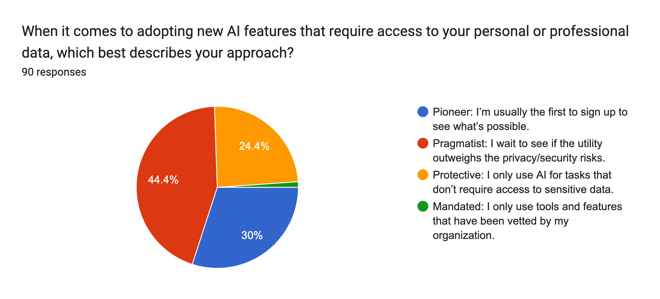 This hesitation aligns well with how this audience now defines its overall approach to AI adoption. We asked respondents to categorize their mindset when adopting features that require personal data.
