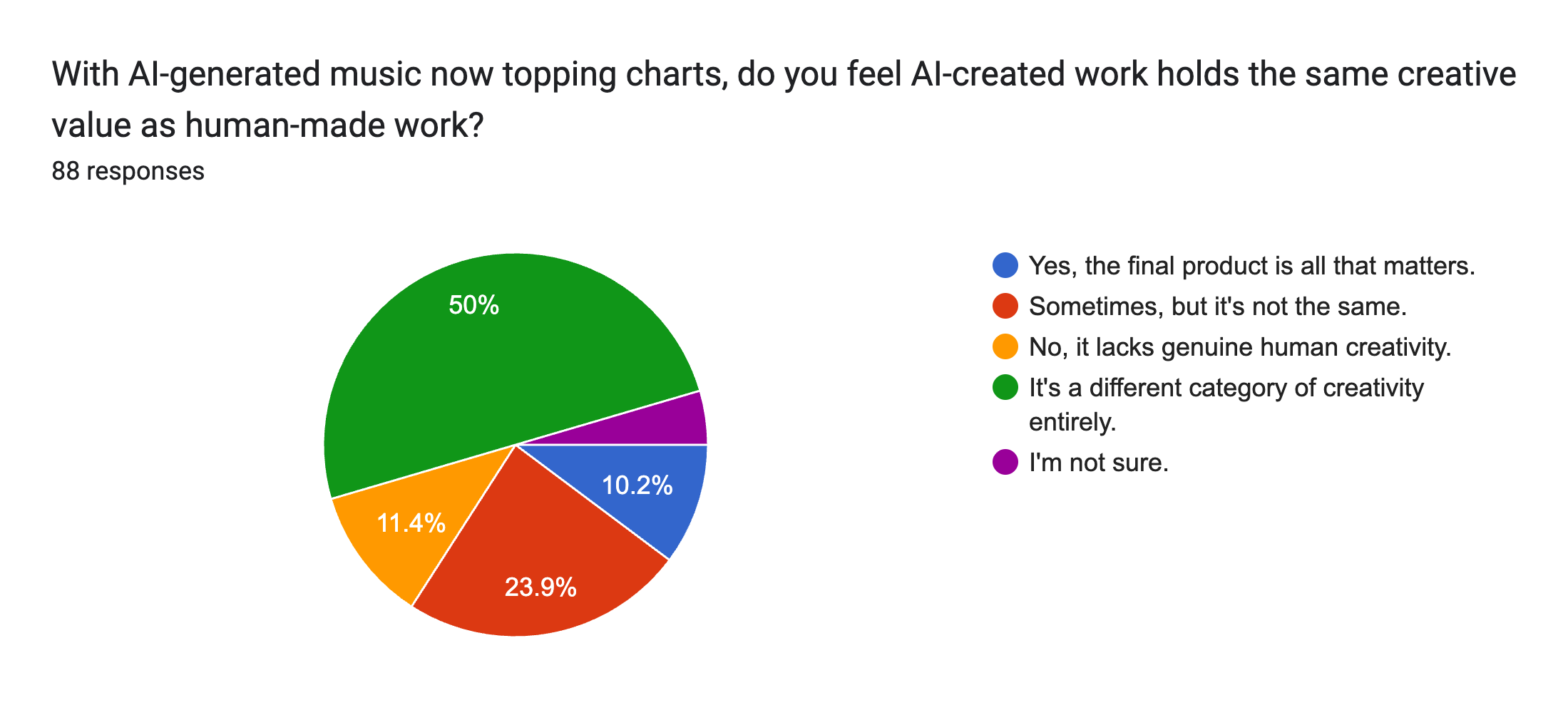 We also queried the audience on the nature of AI-generated work. With AI music and art gaining mainstream traction, we asked: "With AI-generated music now topping charts, do you feel AI-created work holds the same creative value as human-made work?"