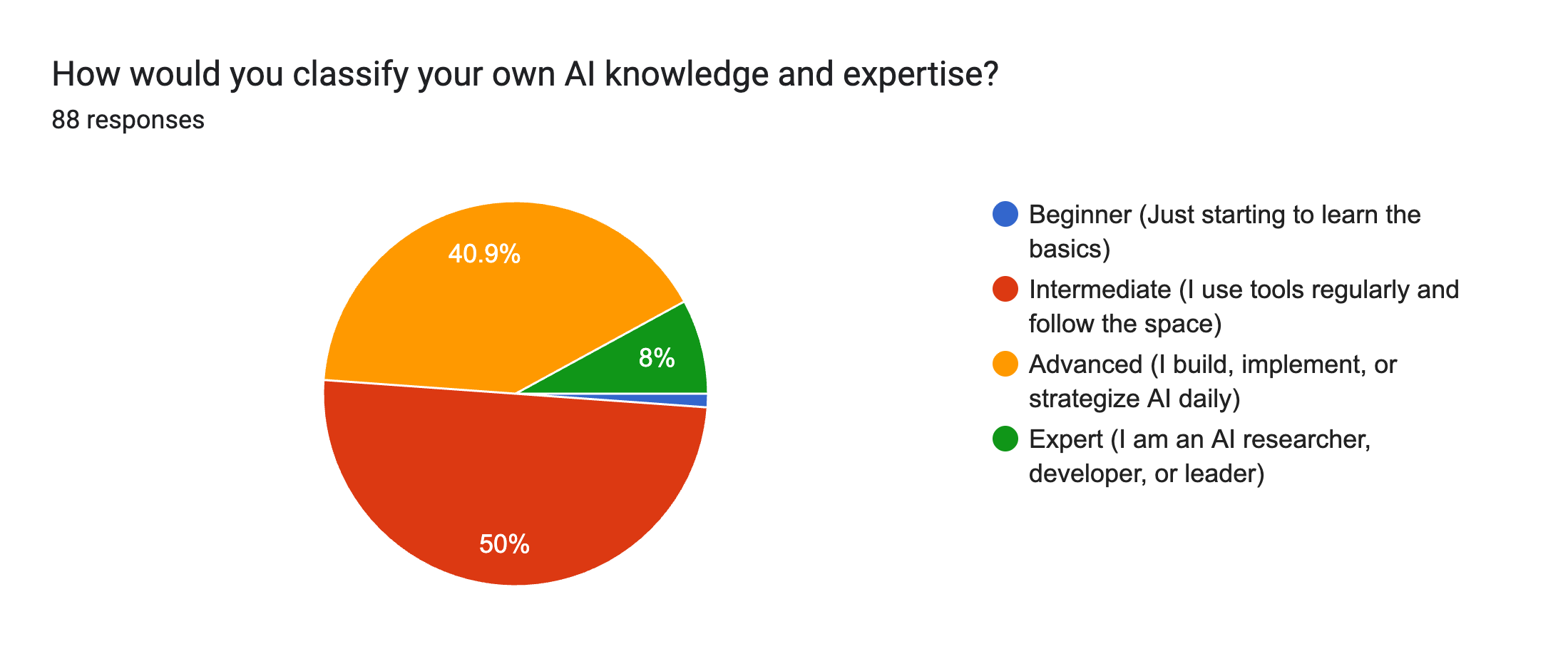 The respondent pool is comprised almost entirely of regular users and practitioners. 40.9% classified themselves as "Advanced," noting they build, implement, or strategize AI daily. Another 50.0% identified as "Intermediate," using tools regularly and following the space.