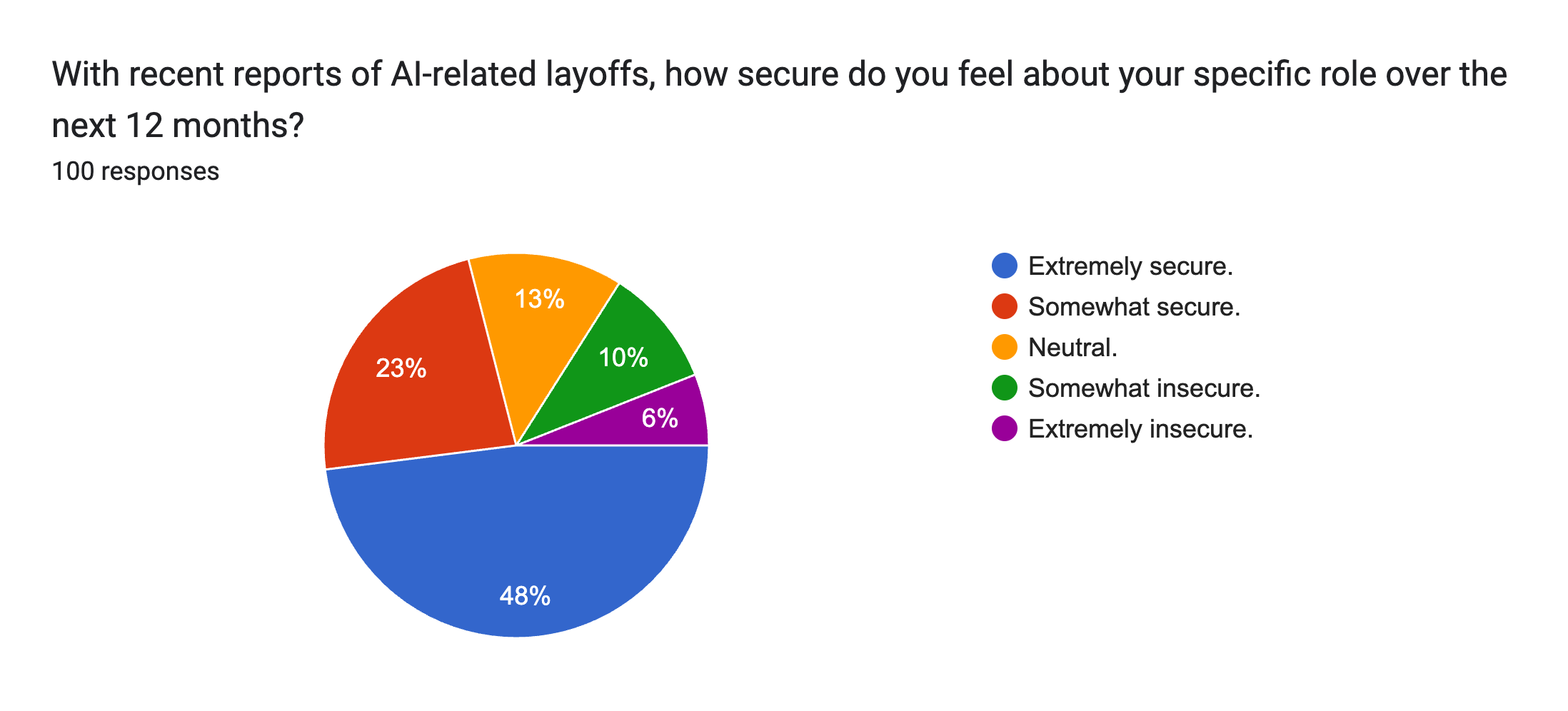 When asked how secure they feel in their specific roles over the next 12 months, the vast majority of our audience expressed confidence, sharply contrasting with broader media narratives about AI-driven job displacement.