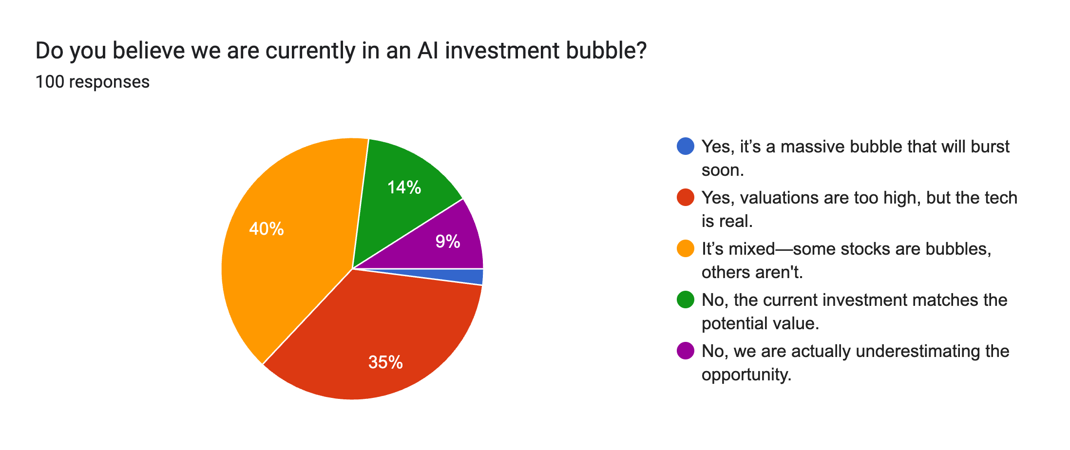 We also asked our audience to weigh in on the "AI Bubble" debate. With billions flowing into AI infrastructure and startups, we wanted to know if they believe we are in a dangerous investment bubble.