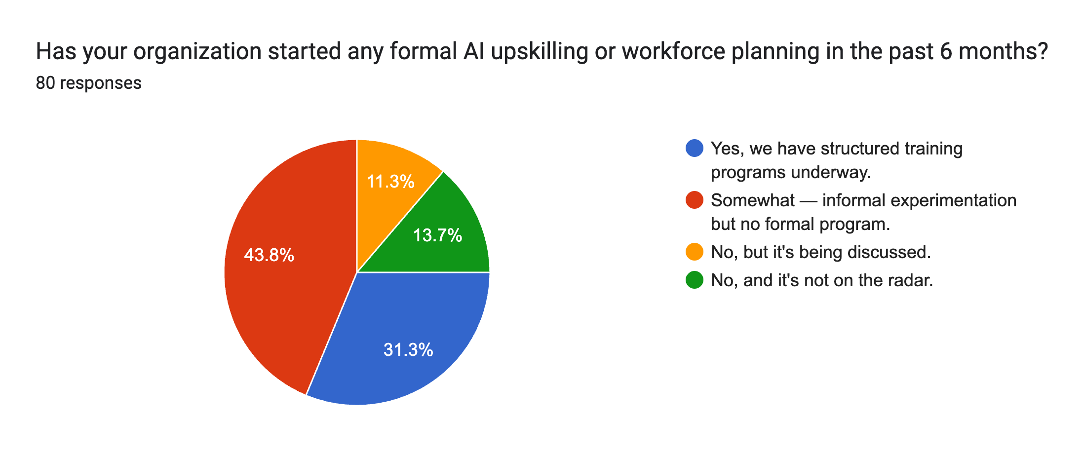 Finally, we asked whether organizations have started any formal AI upskilling or workforce planning in the past six months.