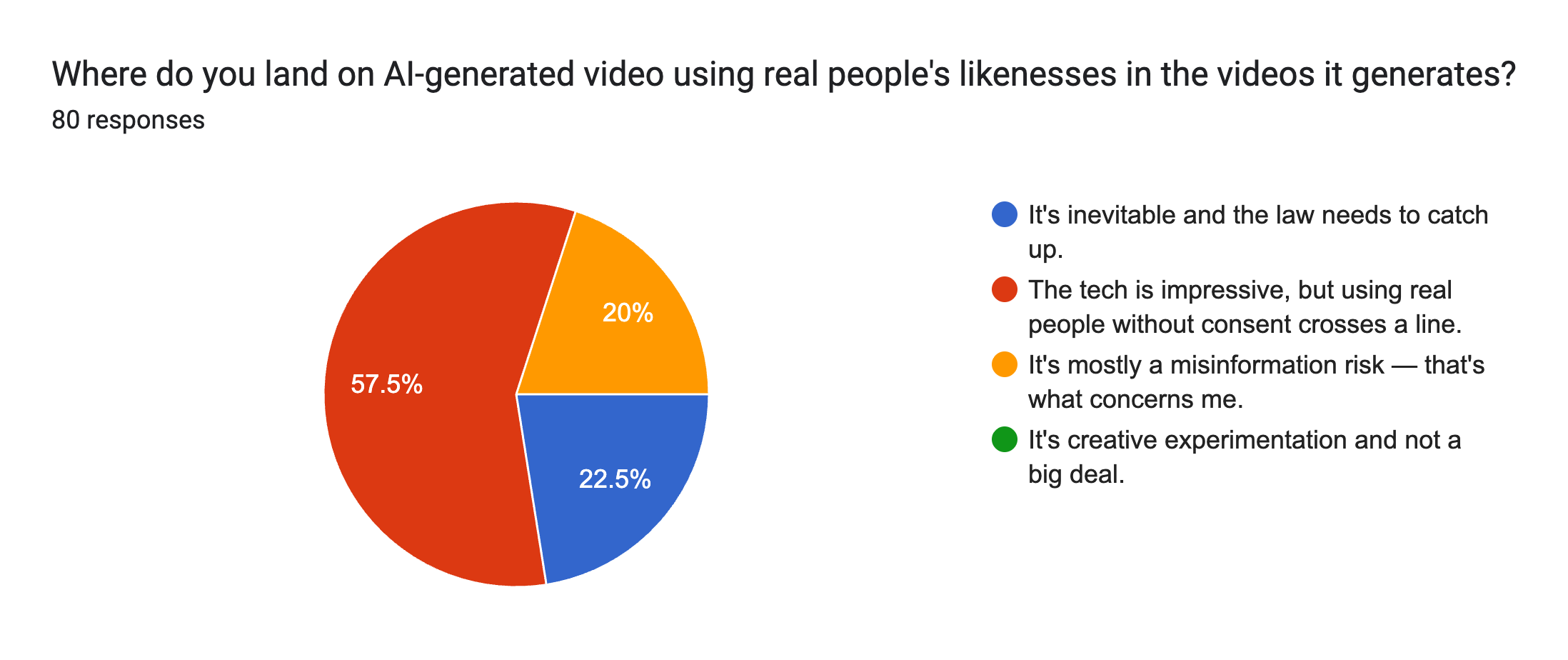 Not a single respondent dismissed the issue. The debate is only about which concern takes priority: consent, misinformation, or inevitability. The largest group draws the line at consent. But the 22.5% who call it inevitable suggest a meaningful portion of the audience has already moved past whether this should happen to how it will be governed.