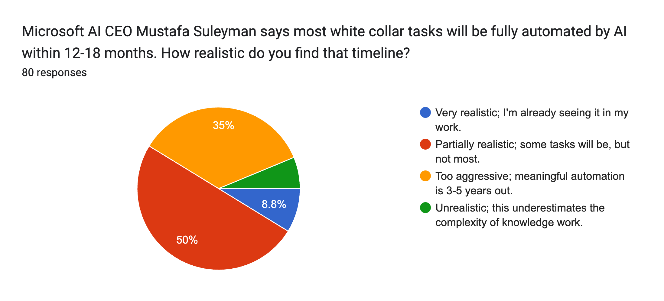 A clear majority of respondents to our latest AI Pulse survey say Microsoft AI CEO Mustafa Suleyman's prediction that most white-collar tasks will be fully automated within 12-18 months is too aggressive.